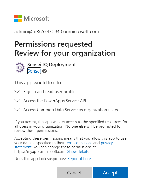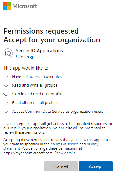 Sensei IQ is a Managed Solution offering integration with your Microsoft 365 tenant, and will require consent for deployment and continued operation. To facilitate this, an administrator will need to grant consent for the Sensei software to work in conjunction with your Microsoft 365 tenant.