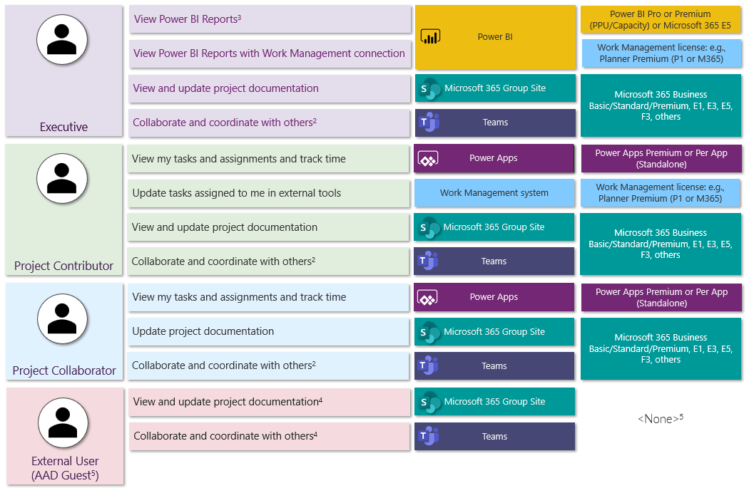 1 – License multiplexing rules for work management systems may apply and often require end-users/consumers of data from those systems to hold an end user license. Contact the 3rd party vendor for more information on their individual licensing requirements. 2 – Collaboration via Teams excluding the Sensei IQ Teams Application (this requires a Power Apps license). 3 – Viewing Power BI reports requires a Power BI license or capacity allocated to the workspace. 4 – Guest access via Teams and SharePoint has limitations and additional tenant requirements. 5 – AAD Guest access to the Sensei IQ Teams & Power App is not currently supported, but is likely to be enabled by a future update.