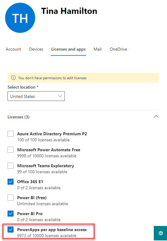 - Ensure that you've granted each user "PowerApps per app baseline access" under 'Licenses and apps'.