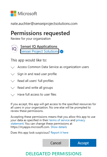- Doesn't change the security posture of the Microsoft 365 tenant other than to trust Sensei software to work on behalf of the users to perform actions they could already do manually.